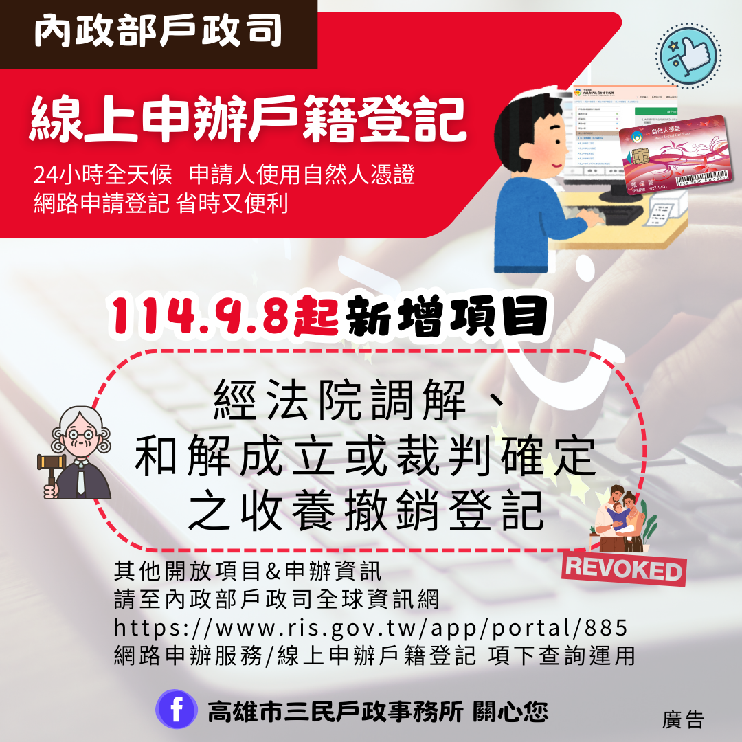 內政部公告「經法院調解、和解成立或裁判確定之收養撤銷登記,得由民眾以自然人憑證於網路申請登記,並自114年9月8日起開放,歡迎多加利用。