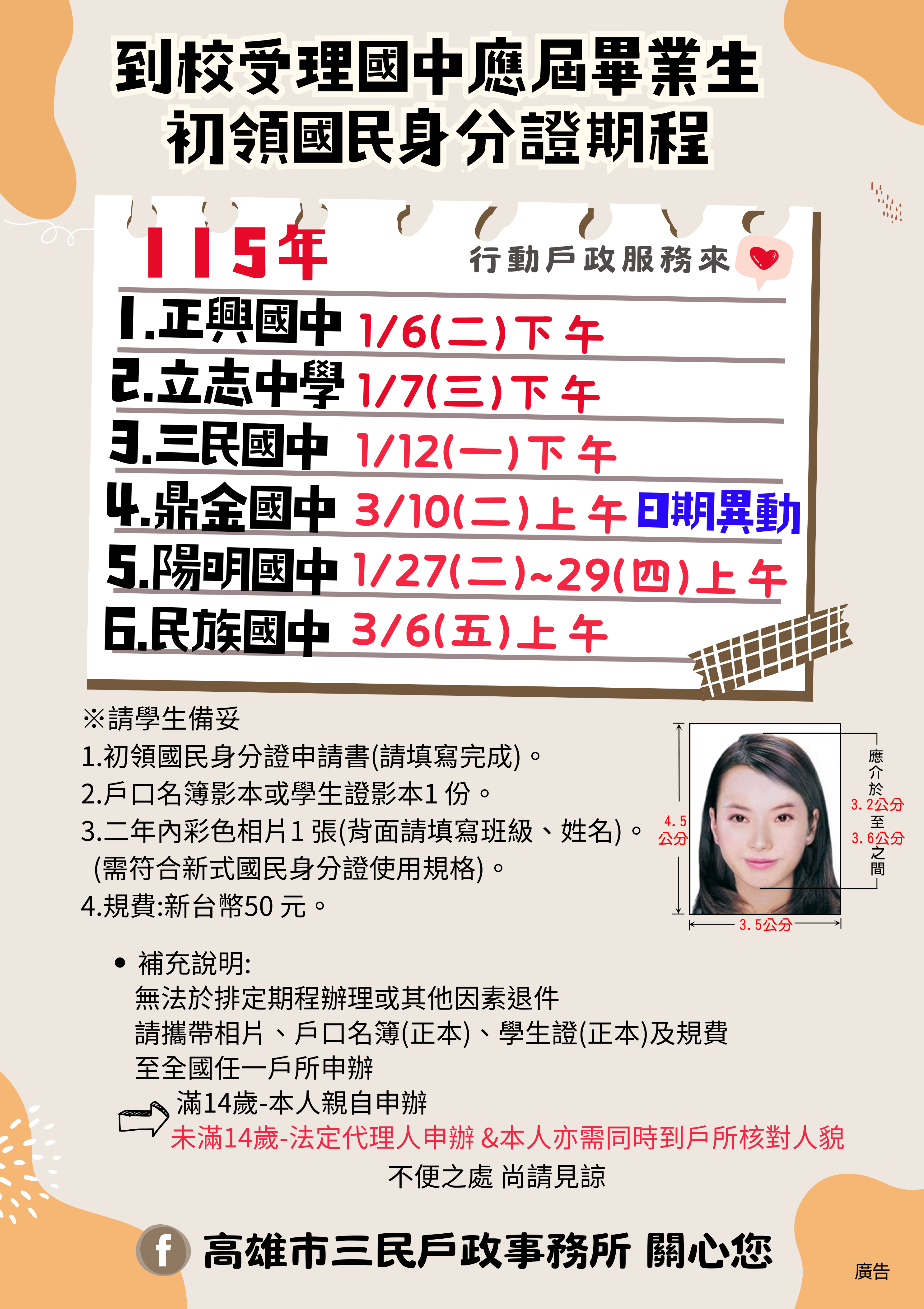 本所為服務三民區國民中學應屆畢業生初領國民身分證,自公告日起至115年3月31日止至各校受理收件,請同學多加利用此項便民措施,以節省往返辦理時間。